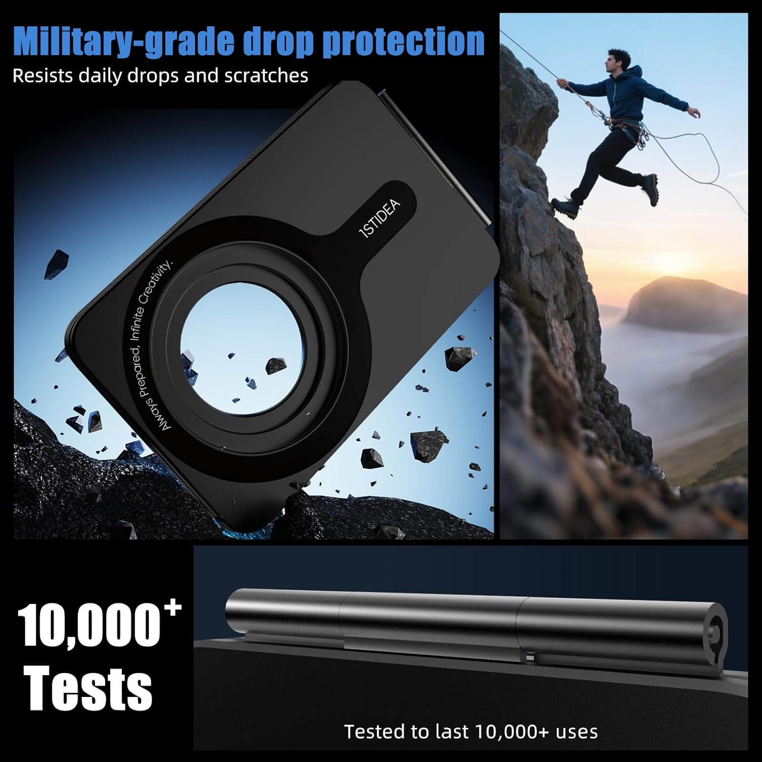 Crafted from next-generation aluminum alloy, the stand is strong, stable, and smooth to the touch. The reinforced hinge locks securely into multiple angles, giving you total control over portrait and landscape modes. With built-in high-strength magnets, it snaps onto MagSafe iPhones instantly—or any smartphone when paired with the included metal ring.